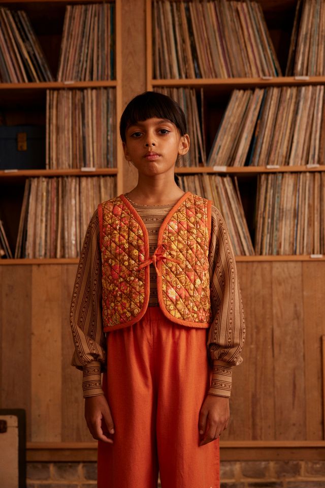 Our signature gilet is back in our retro-inspired ‘autumn harvest floral’ cotton, with a contrasting rustic cotton-linen lining. Featuring poppy binding and front tie fastening. This sweet quilted vest adds a vintage mood to any outfit and looks lovely layered over dresses, jersey or knits, for cosy everyday style.