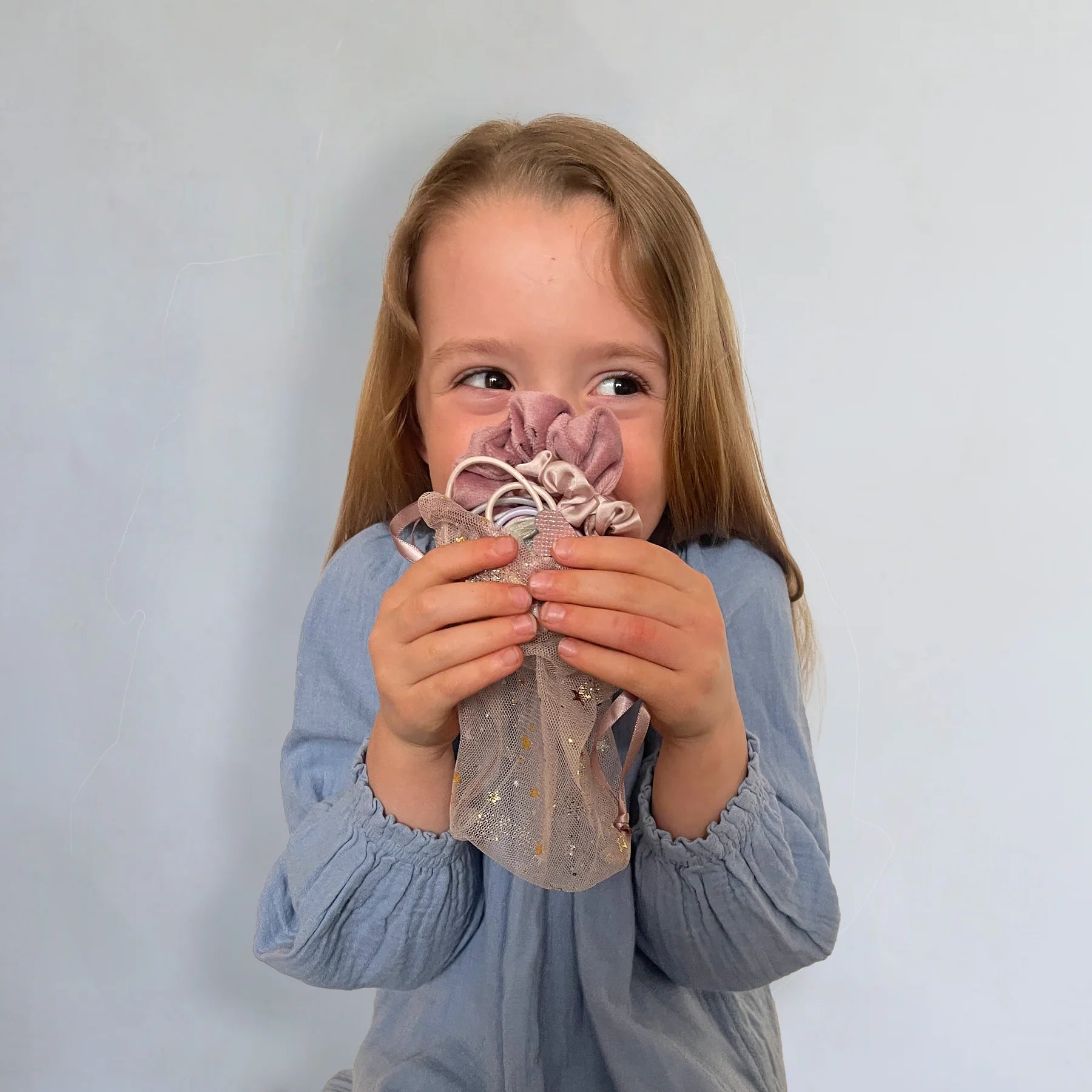 Gifting just became even more magical with this beautiful new tulle pouch! Untie the satin ribbon to reveal a beautiful assortment of hair bands and scrunchies. A mix of styles in a perfectly pretty palette of pinks, metallics and greys, ideal for every day styling!