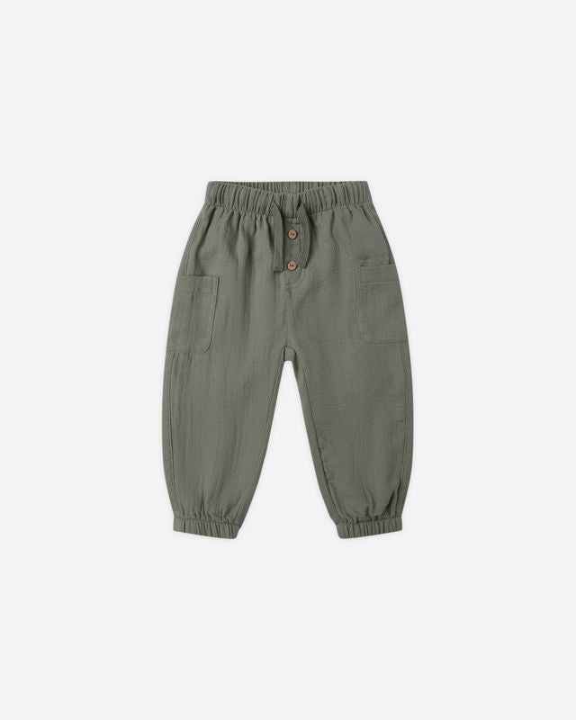 Comfortable corduroy pants with an elastic waistband and leg openings, adjustable drawstring, and side patch pockets.
