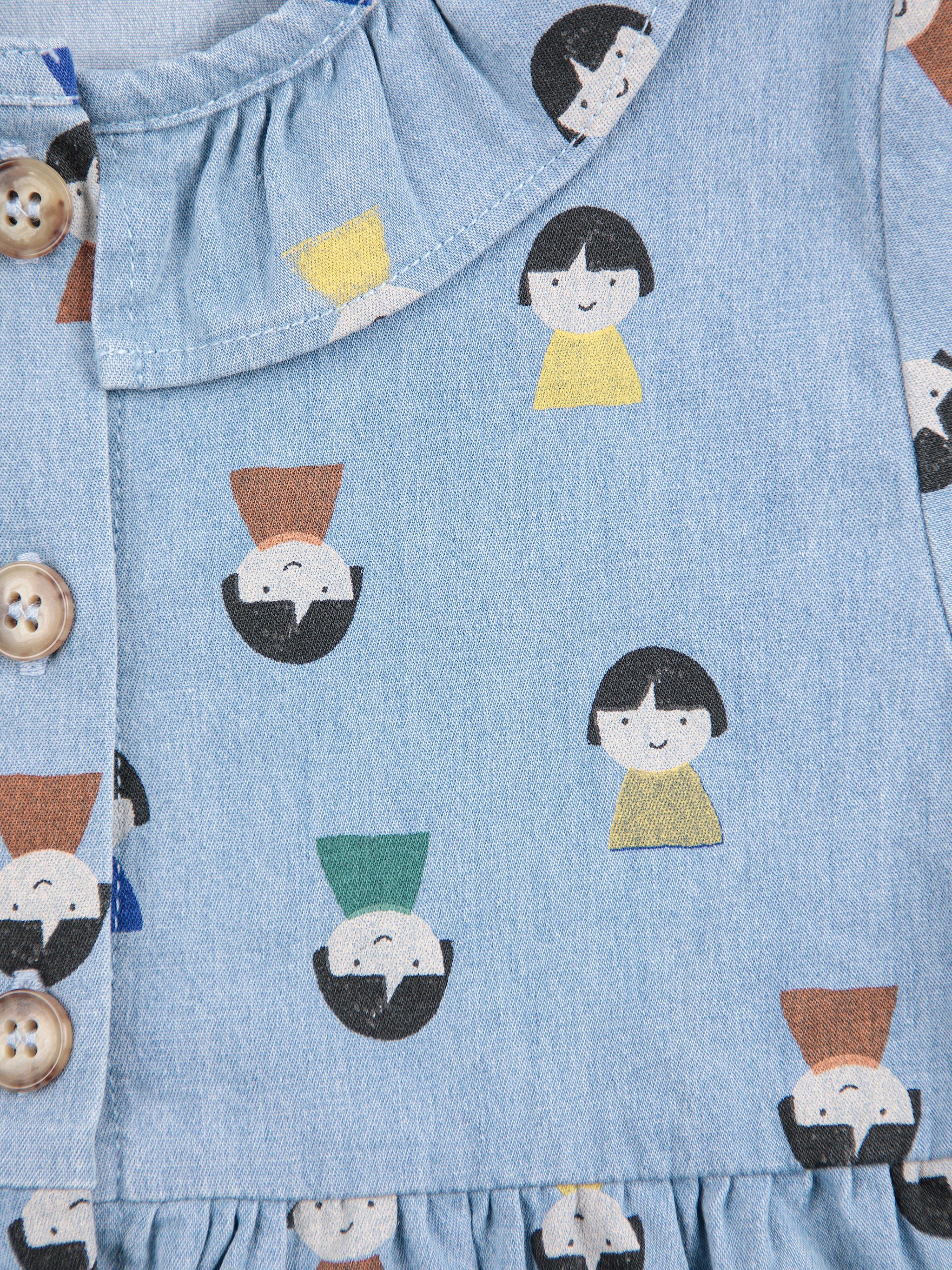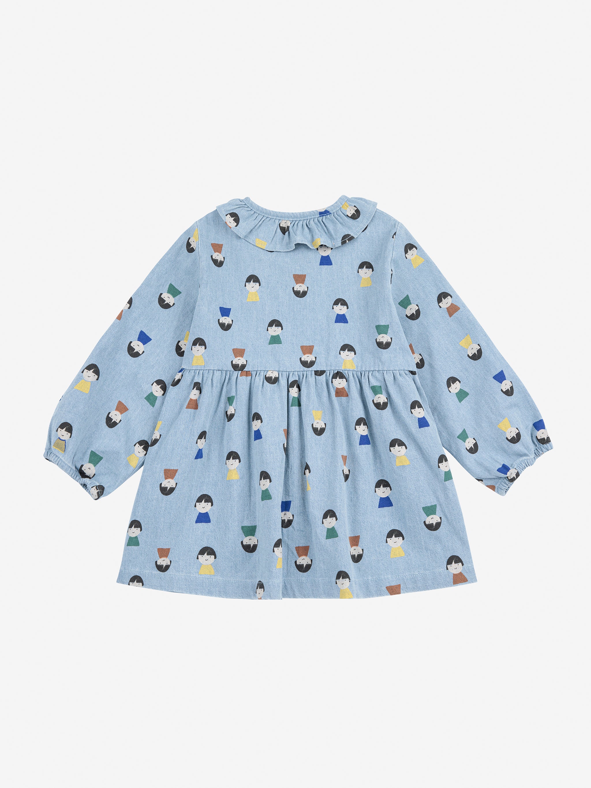 "Light blue dress. Designed with long sleeves, dropped shoulder, front button fastening, elasticated cuffs, embroidery, evasé fit, over knee length, round neck, denim and ruffled detailing. Made in Spain.