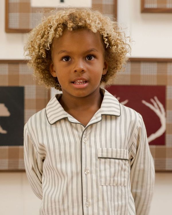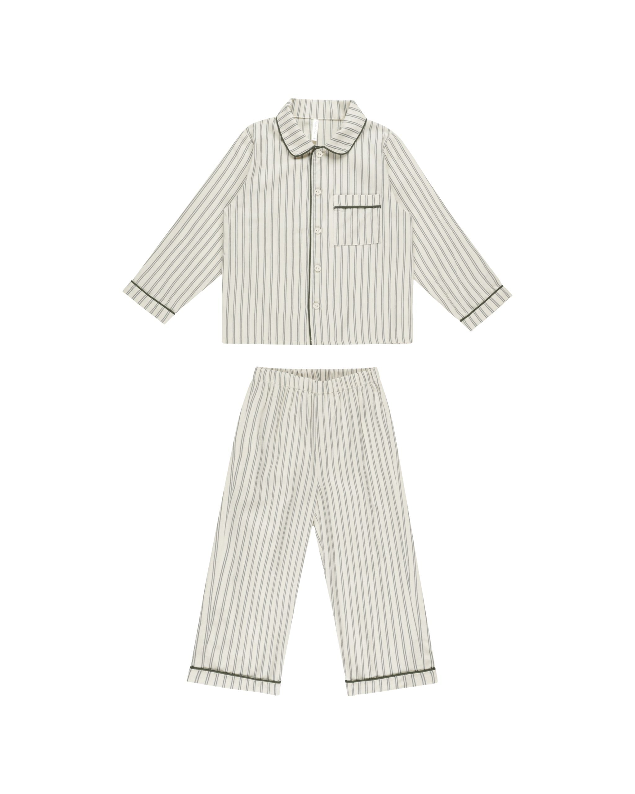 Our new Boys pj set includes a soft long sleeve top and cozy pants. The top has a pocket at the front, and the pants have an elasticized waistband.