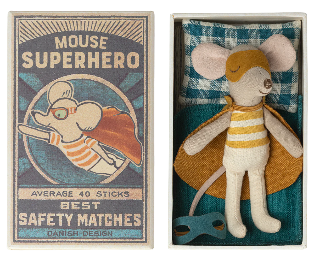 A classic Maileg item. This mouse is ready for hours of play and sleeps tight in a little matchbox. The clothes and bed linen come in unique prints and beautiful colors. Two face masks included - one for flying and one for sleeping.
