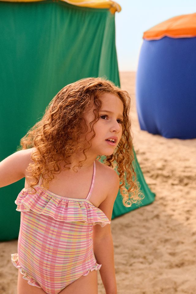 Waffle swimwear fabric in Pink Island Checks. Criss crossed back straps and ruffle details.