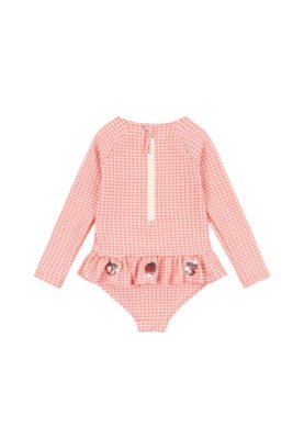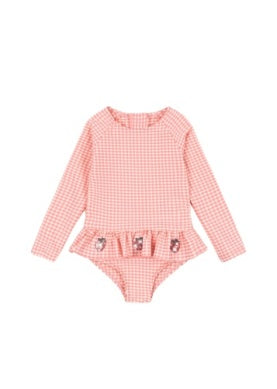 Swimsuit in a textured seersucker fabric with frills and cherry sequin details. Designed with long sleeves for extra protection against harsh UV rays, and crafted in a quick-drying and flexible fabric that is perfect for long days by the beach or pool. Press buttons at leg opening from size 6M -18M