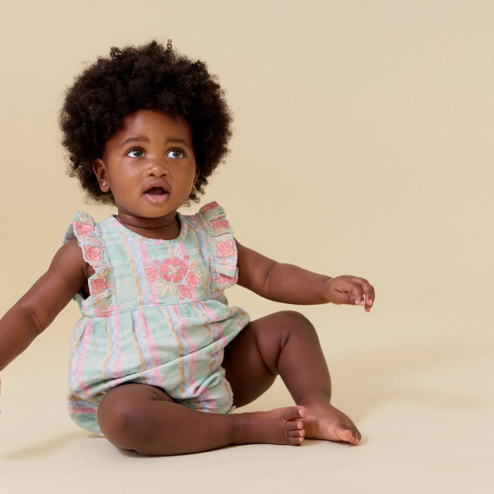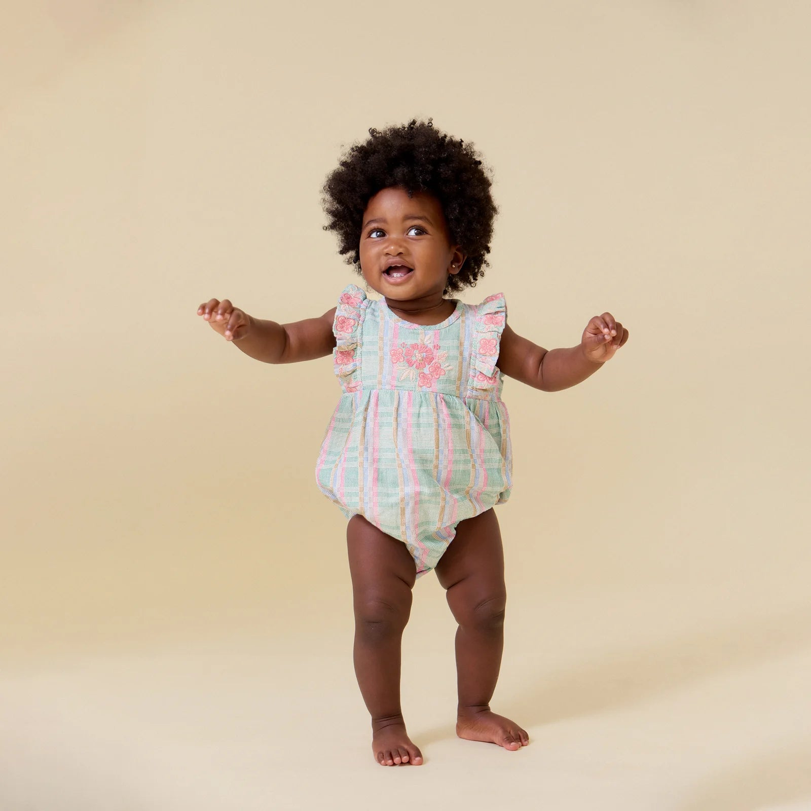 We know there is nothing cuter than a baby in a romper. Our Flora Romper in Minty Chex with Embroidery is a perfect addition to your baby's wardrobe with its easy, throw on-and-go delight, special details of playful ruffles, scalloped edges and exquisite embroidered yoke on 100% custom cotton woven slub. Whether this little beauty is a gift or for keeps, the sweet recipient will be wrapped in beauty and comfort all season long.