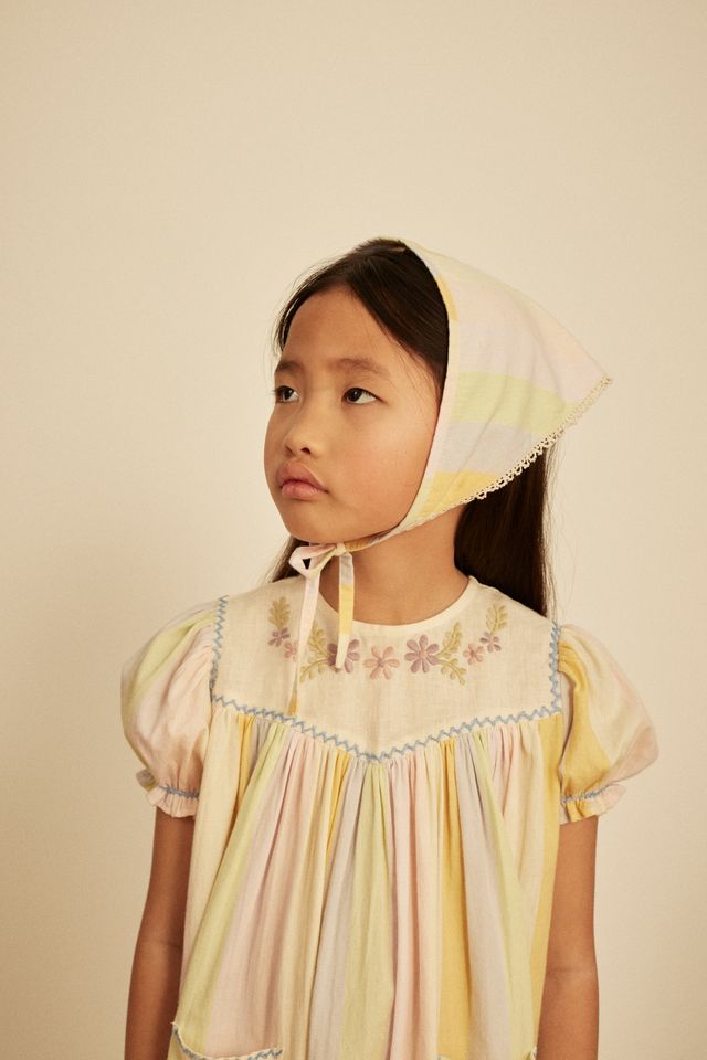 The prettiest dress with an eclectic vintage mood, Kiki comes in the season’s ‘painters stripe’ cotton, with 1940s-inspired triangular shaping to her contrast yoke and pockets. Featuring sweet embroideries at yoke and pockets, and contrast blue feather stitch finishing. Invisible zip closure at back. We love Kiki worn for parties and summer holidays–simply style with socks and sandals.