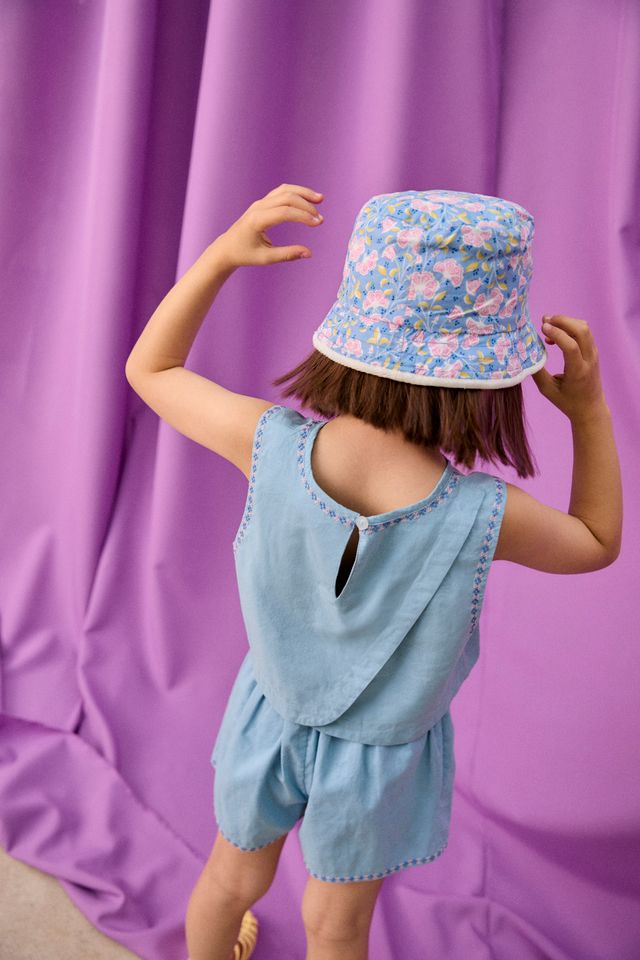Cotton veil shorts. Gathered and elastized waist at the back. Overlay effect and side slits. Textured embroidery on the front. Embroidered trim on front and back. Back patch pockets.