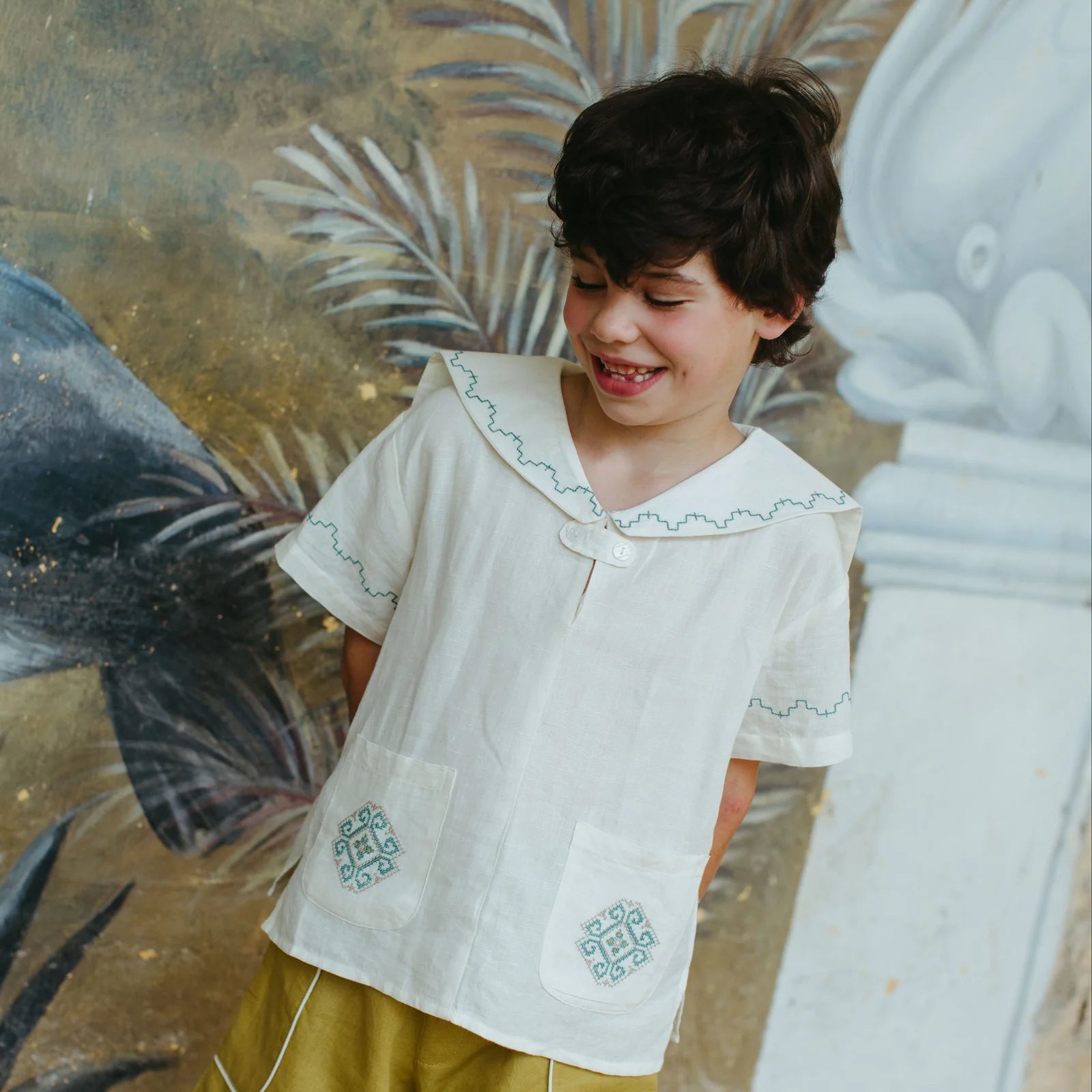 Set sail this spring in the Sailor Shirt in Antique White, crafted from a medium-weight linen-cotton blend for the perfect balance of structure and comfort. This gender-neutral favorite features a classic sailor collar, embroidered sleeves, and charming motifs on each pocket, finished with thoughtful details like a functional mother-of-pearl button tab at the neck and a back pleat for easy movement. Pair it with our Birch Shorts, Paperbag Shorts, or Twirly Skirt for a perfectly polished look.