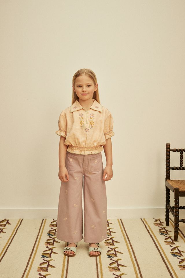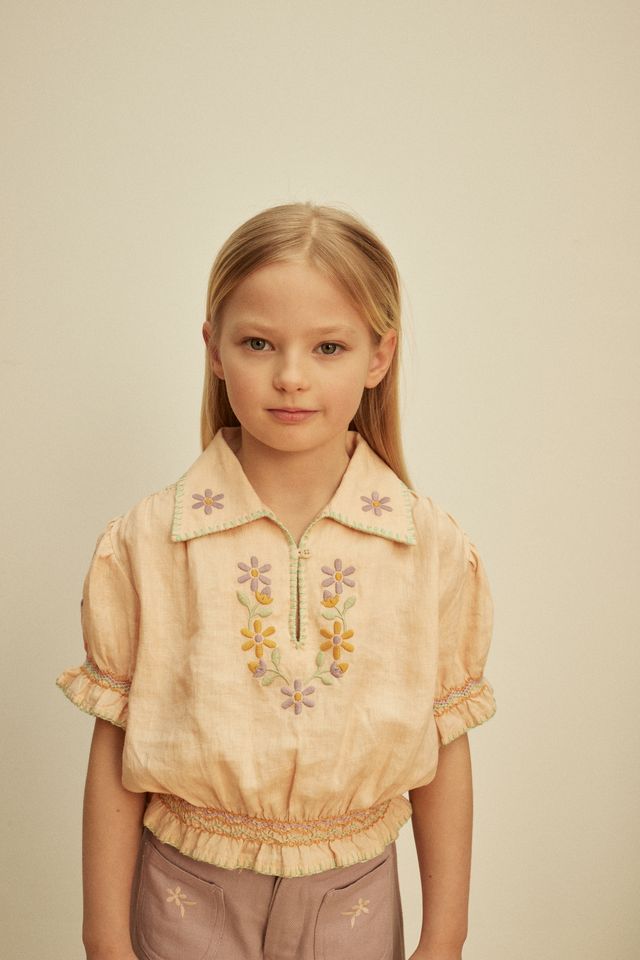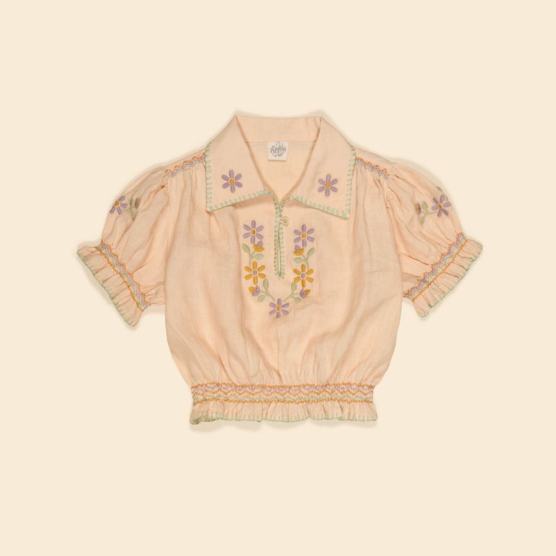 Inspired by European blouses of the 1930s, the Valerie blouse in our ‘satin pink’ linen is full of sweet vintage detailing. Featuring pastel-toned embroideries at collar, sleeves and chest, and pastel rainbow smocking at shoulders, sleeves and waist. With double blanket handwork at collar and blanket stitch finish at hem and sleeve. Single button keyhole fastening at front. Valerie’s ice cream shades bring a sweet retro holiday mood. We especially love her styled with our Casey shorts and jeans.